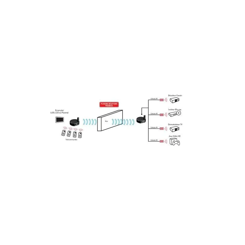 Ce déport de télécommande sans fil permet de commander jusqu'à 3 sources de lecture audio-vidéo situées dans une pièce autre que celle où se trouve l'écran/vidéoprojecteur. De plus, cet appareil est compatible Canal + .