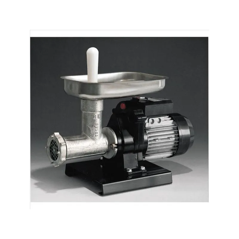 Hachoir à viande avec moteur électrique à induction - plaque et couteaux auto aiguisage en acier - ventilateur de refroidissement - boitier interrupteur - condensateur étanche - vis sans fin et barre de serrage en fonte étamée alimentaire - capacité de 50 à 90 kg/heure - livré avec une grille de 6 - puissance 500 w.