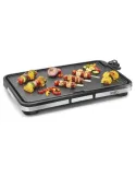 Plancha électrique - Grande plaque antiadhésive de 54,5 x 30 cm, soit 1635 cm2 pour une utilisation conviviale pour 8 à 10 personnes - Parfaite pour cuire des pièces de viande ou de poissons, les poêlées de légumes... - Résistance intégrée à la plaque pour une montée en température quasi-instantanée, sans préchauffage - Thermostat extractible, avec loquet de déverrouillage, réglable selon 5 niveaux de températures ajustables dont maintien au chaud - Chaleur uniformément répartie sur la plaque pour une cuisson précise et saine - Larges sillons d'évacuation des graisses et jus de cuisson pour une cuisson dorée et snackée - Bac récupérateur jus et graisses amovible pour faciliter le nettoyage - Grandes poignées de transport - Plaque lavable au lave-vaisselle (en enlevant le thermostat au préalable) - Coloris Noir et Inox - Puissance 2200 W - Garantie 2 ans.